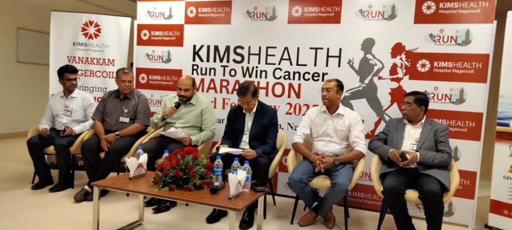 குமரி மாவட்டம் மக்கள் மத்தியில், குறிப்பாக கடலோர பகுதிகளில் வசிக்கும் மக்கள் மத்தியில் புற்றுநோய் பற்றிய விழிப்புணர்வு ஏற்படுத்தும் வகையில், எதிர் வரும் (பிப்ரவரி-23)நாள் நடந்த இருக்கும் மராத்தான் விழிப்புணர்வு ஏற்படுத்த”புற்றுநோயை வெல்ல ஓடு” என்ற நிகழ்வை, நாகர்கோவில் அண்ணா விளையாட்டில் நடக்க இருப்பது குறித்து, கிம்ஸ் ஹெல்த் குழுமத்தின் தலைவர் மற்றும் நிர்வாக இயக்குநர்