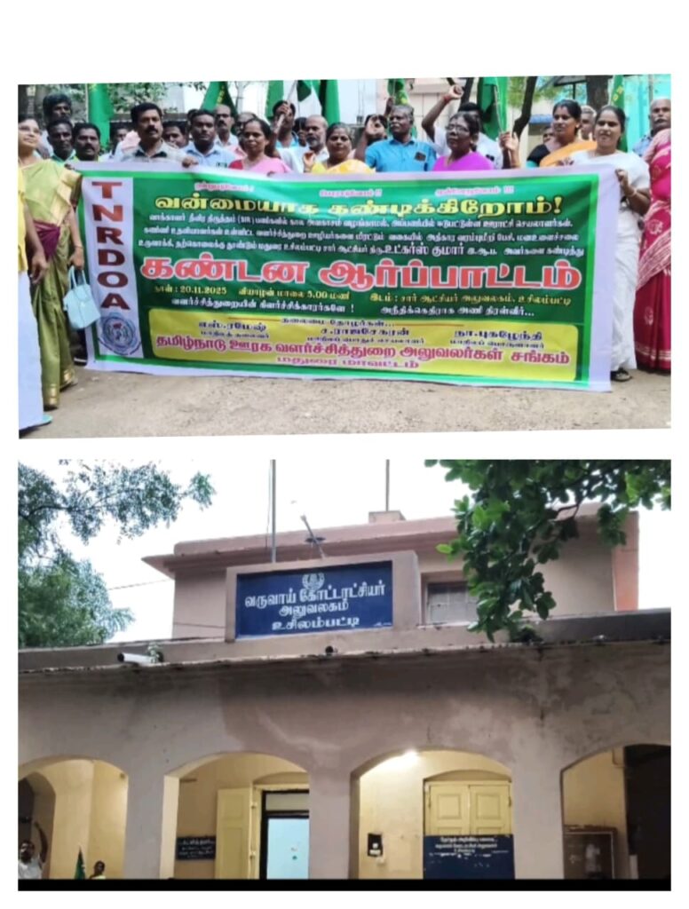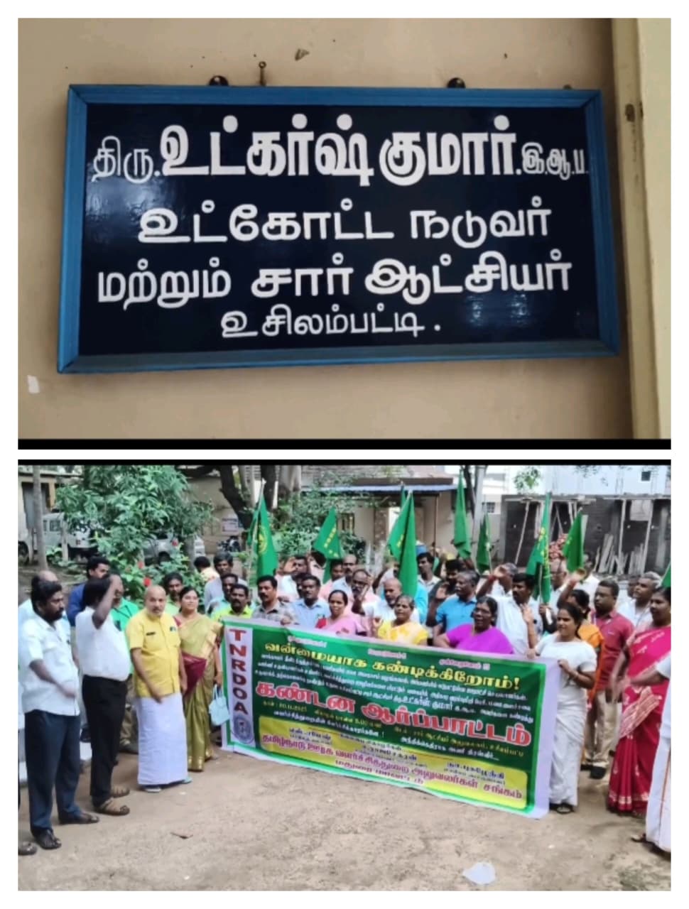 சார் ஆட்சியர் ஆடியோவில் பேசியது மிரட்டும் தோணியில் பேசியுள்ளதாக குற்றம் சாட்டி இன்று உசிலம்பட்டி சார் ஆட்சியர் அலுவலகம் முன்பு தமிழ்நாடு ஊரக வளர்ச்சித்துறை அலுவலர்கள் சங்கம் சார்பில் கண்டன ஆர்ப்பாட்டத்தில் ஈடுபட்டதால் பரபரப்பு ஏற்பட்டது.,