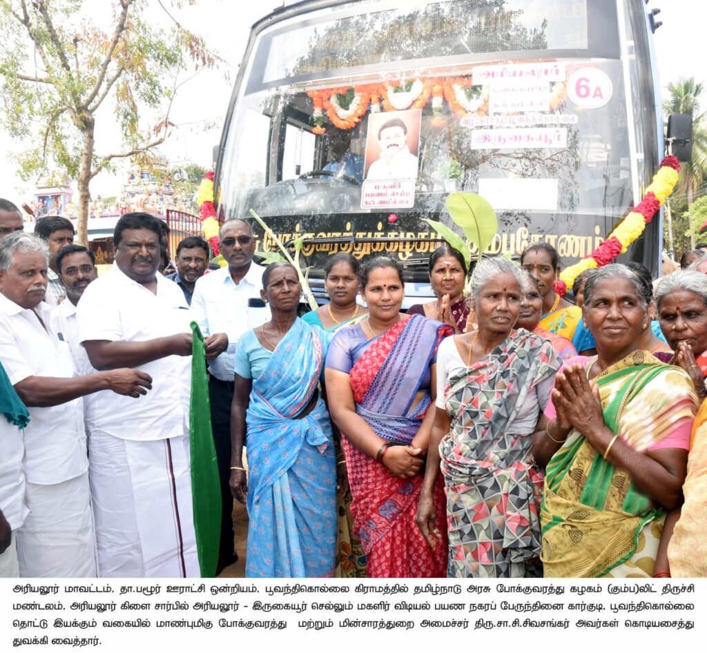 அரியலூர் மாவட்டம், சுத்தமல்லி ஊராட்சியில் தமிழ்நாடு அரசு போக்குவரத்து கழகம் (கும்ப)லிட் திருச்சி மண்டலம், சார்பில் த.குடிக்காடு, மற்றும் பூவந்திக் கொல்லை கிராமத்தில் 02 மகளிர் விடியல் பயண பேருந்துகள் வழித்தடத்தினை நீட்டிப்பு செய்து மற்றும் சுத்தமல்லி ஊராட்சியில் புறநகர் பேருந்து தடம் மாற்றம் செய்து பொதுமக்கள் பயன் பாட்டிற்கு போக்குவரத்து மற்றும் மின்சாரத்துறை அமைச்சர் சா.சி.சிவசங்கர் கொடியசைத்து துவக்கி வைத்தார்.