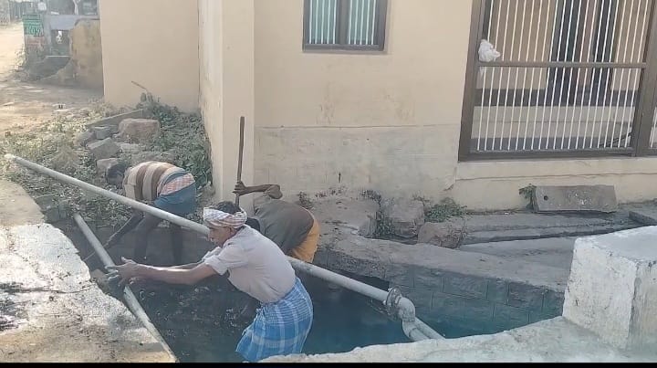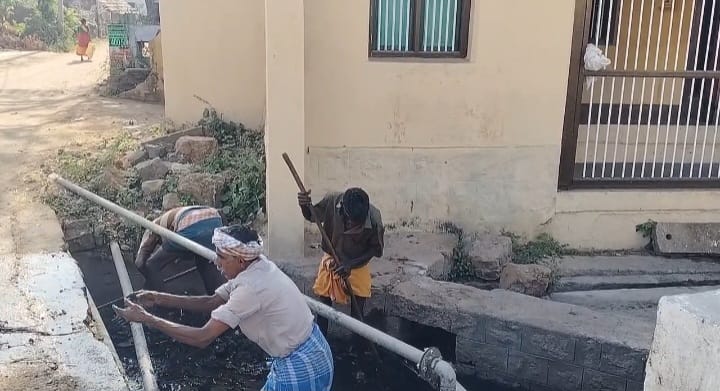 மதுரை மாவட்டம் சோழவந்தான் அருகே உள்ளது காடுபட்டி ஊராட்சி இங்கே தற்போது கலையரசி ராதிகா நடிப்பில் வெற்றிகரமாக திரையரங்குகளில் ஓடிக்கொண்டிருக்கும் தாய்க்கிழவி பவுன் தாய் வீடாக படப்பிடிப்பு செய்யப்பட்ட வீட்டின் முன்பு காடுபட்டி ஊராட்சி தூய்மை பணியாளர்கள் எந்தவித பாதுகாப்பு உபகரணங்களும் இன்றி வெறும் கையால் சாக்கடை கழிவை சுத்தம் செய்து வருகின்றனர்.