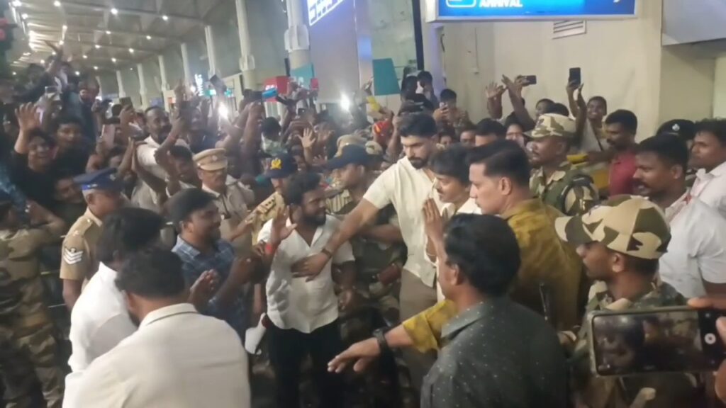 மதுரை விமான நிலையத்தில் தமிழக வெற்றி கழகத் தலைவர் விஜயை வரவேற்க திரண்ட ரசிகர்கள் காட்டுமிராண்டித்தனமாக செயல்பட்டதால் எரிச்சல் அடைந்த மத்திய தொழில் பாதுகாப்பு படையினர் மைக் மூலம் எச்சரிக்கை விடுத்தனர்.