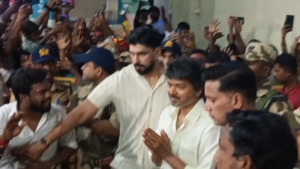 மேலும் விஜ செல்லும் காரின் பின்னே ஆண்களும் பெண்களும் ஓடிக்கொண்டே இருந்தனர் இதனால் பாதுகாப்பு பணியில் இருந்த போலீசார் செய்வதறியாமல் திகைத்து நின்றனர். பின்னர் திருச்செந்தூர் சென்ற தமிழக வெற்றி கழக தலைவர் விஜய் சத்ர சம்ஹார பூஜை நடத்தி முருகனை வழிபட்டார். முன்னதாக கடலில் இறங்கி காலை நனைத்த பிறகு பின் கோவிலுக்கு சென்று முருகனை வழிபட்டார். பட்டு வேஷ்டி மேல் துண்டு மட்டும் அணிந்து முருகனை வழிபட்டு பின் சென்னை திரும்பினார். விஜய் வருவதற்கு முன்பதாகவே திருச்செந்தூரில் நள்ளிரவு முதல் குழந்தைகள் முதல் பெரியவர்களை அதிக அளவு கூட்டங்கள் காணப்பட்டது.