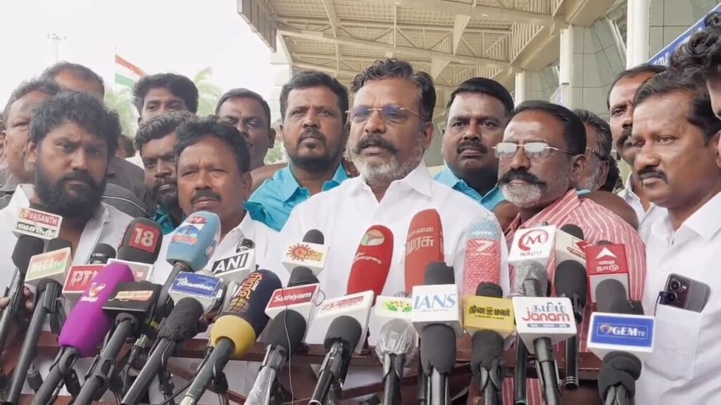 சென்னையில் இருந்து விமானம் மூலம் மதுரை வந்த விடுதலை சிறுத்தைகள் கட்சி தலைவர் தொல் திருமாவளன் மதுரை விமான நிலையத்தில் செய்தியாளர் சந்திப்பு .