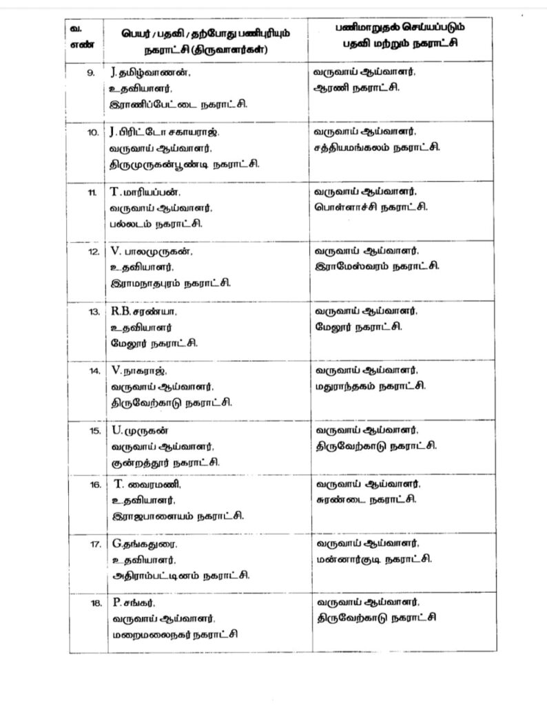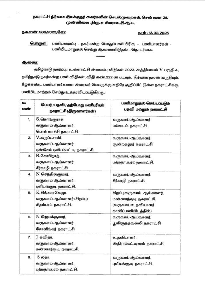 தமிழ்நாடு நகர்ப்புற உள்ளாட்சி அமைப்பு விதிகள் 2023 அத்தியாயம் ஐந்து பகுதி நாலு நகராட்சி பணி விதிகள் எண் 222 படியும் நிர்வாகம் நலன் கருதியும் நகராட்சி பணியாளர்கள் பணி மாற்றம் செய்யப்பட்டுள்ளார். கொங்குராசு, வருவாய் ஆய்வாளர் பொள்ளாச்சி நகராட்சியில் இருந்து பல்லடம் நகராட்சி வருவாய் ஆய்வாளராக மாற்றப்படுகிறார். கருப்பசாமி வருவாய் ஆய்வாளர் புஞ்சை புளியம்பட்டி நகராட்சியில் இருந்து குன்றத்தூர் நகராட்சிக்கு வருவாய் ஆய்வாளராக மாற்றம் செய்யப்படுகிறார். கோபிநாத் வருவாய் ஆய்வாளர் சீர்காழி நகராட்சியில் இருந்து பத்மநாதபுறம் பணியிட மாற்றம் செய்யப்பட்டுள்ளார். செந்தில்குமார் வருவாய் ஆய்வாளர் புளியங்குடி நகராட்சியில் இருந்து சீர்காழி நகராட்சிக்கு வருவாய் ஆய்வாளராக பணியிடம் மாற்றம் செய்யப்படுகிறார். சிங்காரவேலு வருவாய் ஆய்வாளர் (சிறப்பு) சிதம்பரம் நகராட்சியில் இருந்து (சிறப்பு) வருவாய் ஆய்வாளர் மன்னார்குடி நகராட்சிக்கு பணியிட மாற்றம் செய்யப்படுகிறார். ஜெயக்குமார் வருவாய் ஆய்வாளர் சோளிங்கர் நகராட்சியில் இருந்து பூவிருந்தமல்லி நகராட்சிக்கு வருவாய் ஆய்வாளராக மாற்றப்படுகிறார். கவிதா வருவாய் ஆய்வாளர் மன்னார்குடி நகராட்சியில் இருந்து அதிராம்பட்டினம் நகராட்சி உதவியாளராகவும், லதா வருவாய் ஆய்வாளர் பத்ம நாதபுரம் நகராட்சியில் இருந்து புளியங்குடி நகராட்சி வருவாய் ஆய்வாளராகவும், தமிழ்வாணன் உதவியாளர் ராணிப்பேட்டை நகராட்சி இருந்து வருவாய் ஆய்வாளர் ஆரணி நகராட்சிக்கும்,பிரிட்டோ சகாயராஜ் வருவாய் ஆய்வாளர் திருமுருகன் பூண்டி நகராட்சியில் இருந்து சத்தியமங்கலம் வருவாய் ஆய்வாளராகவும் மாரியப்பன் வருவாய் ஆய்வாளர் பல்லடம் நக ராட்சியில் இருந்து பொள்ளாச்சி நகராட்சி வருவாய் ஆய்வாளராகவும், பாலமுருகன் உதவியாளர் ராமநாதபுரம் நகராட்சியில் இருந்து ராமேஸ்வரம் நகராட்சி வருவாய் ஆய்வாளராகவும், சரண்யா உதவியாளர் மேலூர் நகராட்சியில் இருந்து வருவாய் ஆய்வாளர் வேலூர் நகராட்சியில் நியமிக்கப்படுகிறார். நாகராஜ் வருவாய் ஆய்வாளர் திருவேற்காடு நகராட்சி இருந்து மதுராந்தகம் நகராட்சி வருவாய் ஆய்வாளராகவும், முருகன் வருவாய் ஆய்வாளர் குன்றத்தூர் நகராட்சியில் இருந்து திருவேற்காடு நகராட்சி ந வருவாய் ஆய்வாளர் ஆகவும், தங்கதுரை உதவியாளர் அதிராம்பட்டினம் நகராட்சியில் இருந்து மன்னார்குடி நகராட்சி வருவாய் ஆய்வாளராகவும், சங்கர் வருவாய் ஆய்வாளர் மறைமலைநகராட்சியில் இருந்து திருவேற்காடு வருவாய் ஆய்வாளராகவும் பணி மாறுதல் செய்யப்படுவதாக நகராட்சி நிர்வாக இயக்குனர் சிவராசு, ஐஏஎஸ் உத்தரவிட்டுள்ளார்.