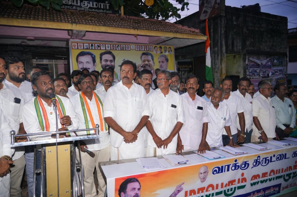 பாஜக அரசின் வாக்கு திருட்டை கண்டித்து காங்கிரஸ் பேரியக்கம் நாடு முழுவதும் நடத்தி வரும் மாபெரும் கையெழுத்து இயக்கம் கன்னியாகுமரி மேற்கு மாவட்ட காங்கிரஸ் கமிட்டி சார்பில் சாமியார்மடம் சந்திப்பில் வைத்து நடைபெற்றது. இதில் பொதுமக்களிடம் வாக்குத் திருட்டுக்கு எதிராக கையெழுத்து பெறப்பட்டது.