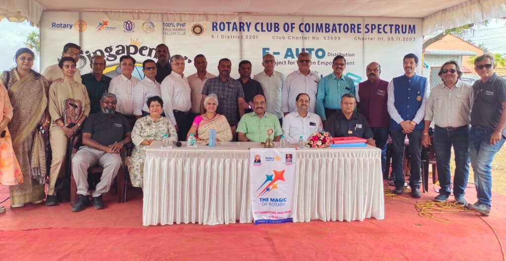 கோயம்புத்தூர், ஜுன் 25, 2025 – பெண்களுக்கான வாழ்வாதார தன்னிலை மற்றும் சுற்றுச்சூழல் பாதுகாப்பை ஒருங்கிணைக்கும் முயற்சியாக, கோயம்புத்தூர் ஸ்பெக்ட்ரம் ரோட்டரி கிளப்பின் தலைமையில் “சிங்கப்பெண்ணே” மின்சார ஆட்டோ வழங்கும் விழா இன்று 2025 ஜூன் 25 அன்று கோயம்புத்தூரில் வெகு சிறப்பாக நடைபெற்றது.