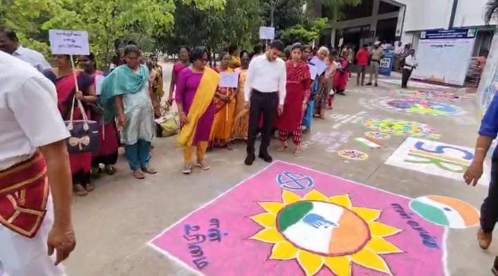 கோவை மாவட்ட ஆட்சியர் அலுவலகத்தில் மகளிர் திட்டம் சார்பில்,வாக்காளர் சிறப்பு தீவிர திருத்தம் குறித்து பொதுமக்களுக்கு விழிப்புணர்வு ஏற்படுத்தும் வகையில் ரங்கோலி கோலம் அமைக்கப்பட்டது.வாக்காளர் பட்டியல் திருத்த பணிகள் நடைபெற்று வரும் நிலையில், பொதுமக்கள் அதிகம் வருகை தரும் ஆட்சியர் அலுவலக வளாகமே விழிப்புணர்வுக்கான தளமாக தேர்வு செய்யப்பட்டது.