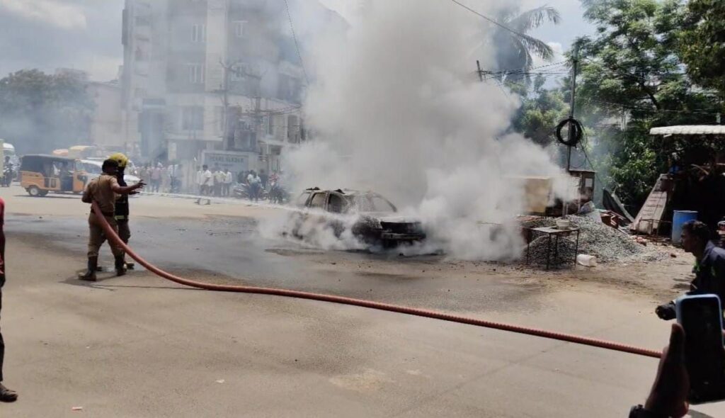 மேலும் கார் முழுவதும் திடீரென தீ பற்றி எறிந்ததால் அந்த பகுதி முழுவதும் புகை மண்டலமாகவே மாறியது இதனால் அந்த பகுதியில் வாகன ஓட்டிகள் செல்ல முடியாத சூழ்நிலை நிலவியது.