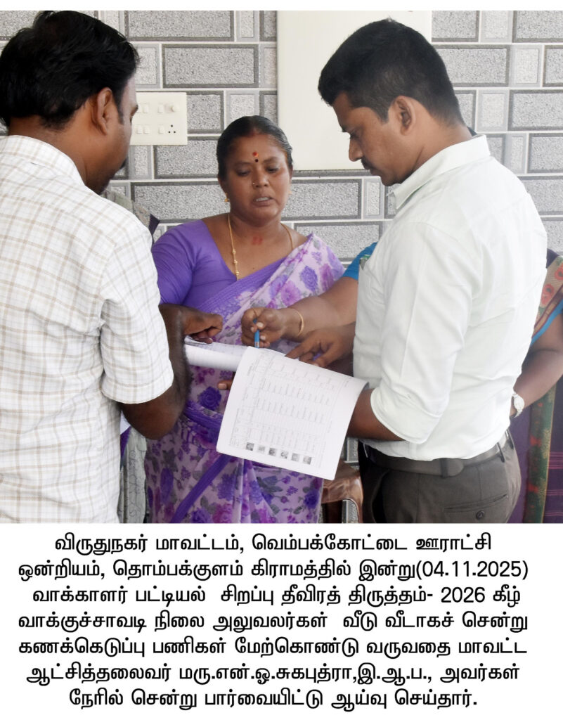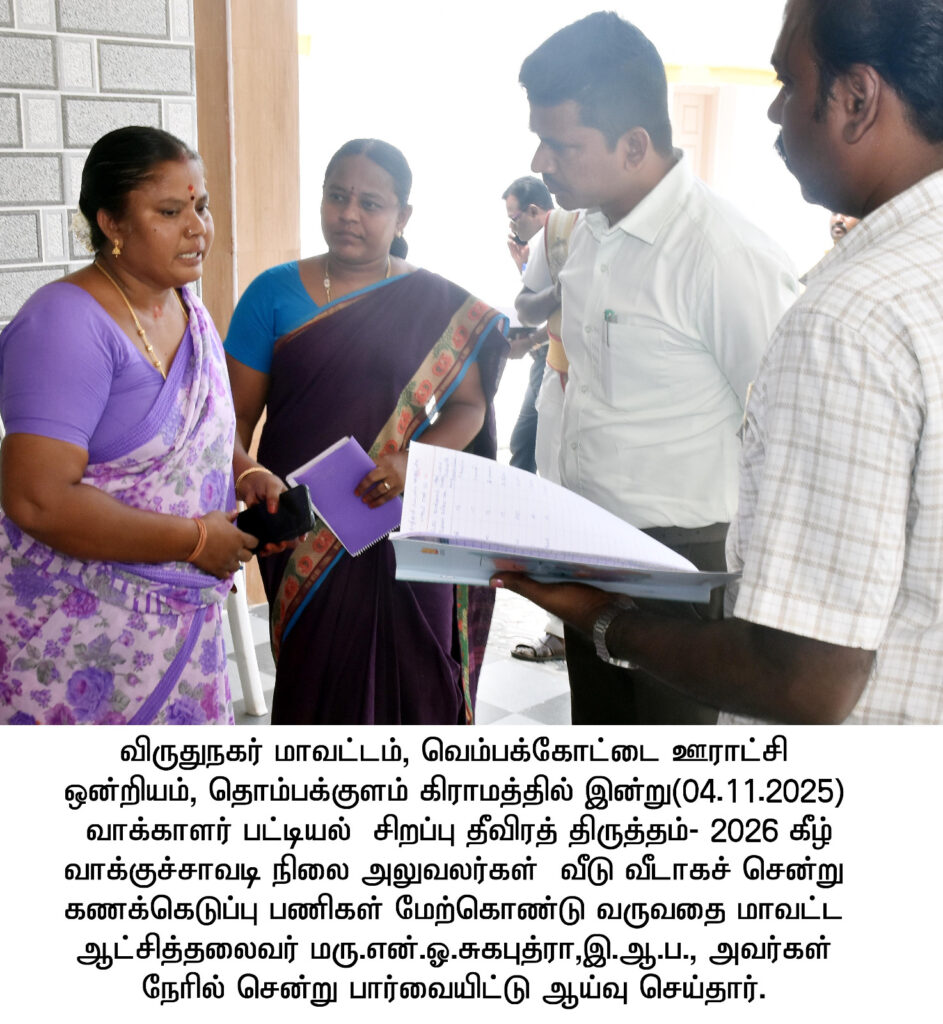 விருதுநகர் மாவட்டம் சிவகாசி அருகே உள்ள வெம்பக்கோட்டை தாலுகா கொங்கன்குளம் ஊராட்சியில் நடைபெற்ற உங்களுடன் ஸ்டாலின் என்ற சிறப்பு முகாமினை மாவட்ட ஆட்சித்தலைவர்.சுகபுத்ரா நேரில் சென்று பார்வையிட்டு, மனுக்கள் பதிவேற்றம் செய்வது, கலைஞர் மகளிர் உரிமைத்தொகை விண்ணப்பங்கள் பெறுவதற்கான சிறப்பு பிரிவுகள் உள்ளிட்டவைகளை ஆய்வு செய்தார்.