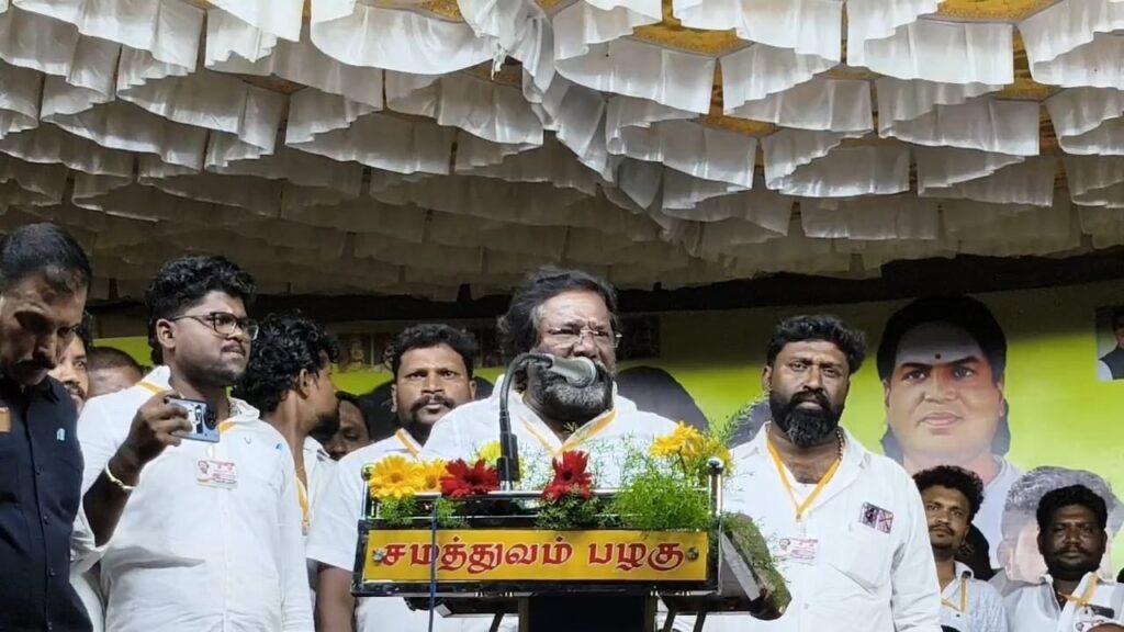 பின்னர் பொதுக்கூட்டத்தில் பேசிய கருணாஸ் பாஜகவின் ஆர்எஸ்எஸ் சித்தாந்தத்தின் வலையில் விழுந்ததன் விளைவாக ஓபிஎஸ் தற்போது எந்த நிலைமையில் இருக்கிறார் என்பதை உணர்ந்து கொள்ள வேண்டும் என்றார்.