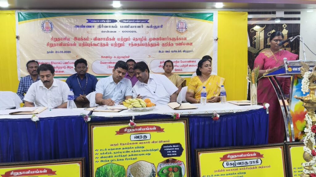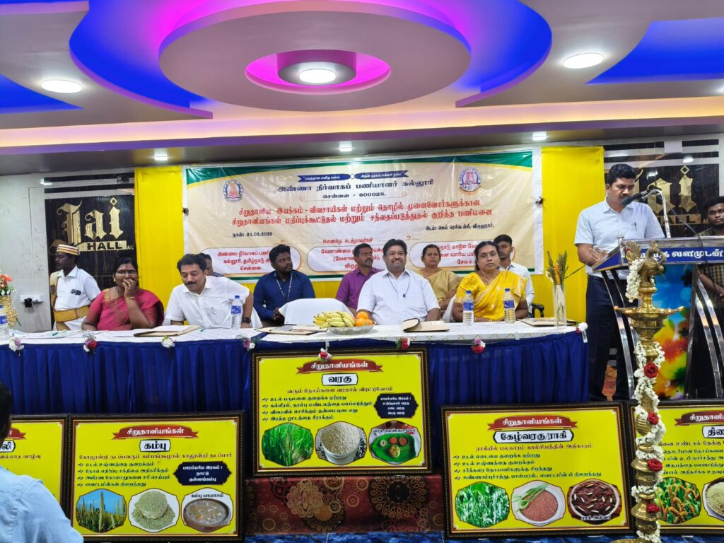 விருதுநகர் ஜெய் ஹோட்டல் மற்றும் ரெசிடன்சி கூட்டரங்கத்தில் சென்னை அண்ணா நிர்வாகப் பணியாளர் கல்லூரி, சேலம் தமிழ்நாடு மாநில வேளாண்மை விற்பனை வாரிய பயிற்சி மையம் மற்றும் விருதுநகர் வேளாண்மை துணை இயக்குநர் (வேளாண் வணிகம்) இணைந்து, விருதுநகர் மாவட்ட ஆட்சித் தலைவர், சுகபுத்ரா, தலைமையில், மதுரை அண்ணா நிர்வாகப் பணியாளர் கல்லூரி மண்டல பயிற்சி மையத்தின் துணை ஆட்சியர் / இளநிலை நிர்வாக அலுவலர், திரு. எம். ரங்கசாமி அவர்கள், விருதுநகர் வேளாண்மை இணை இயக்குநர், திரு. பா. மோகன்தாஸ் சௌமியன் அவர்கள், விருதுநகர் வேளாண்மை துணை இயக்குநர் / மாவட்ட ஆட்சியரின் நேர்முக உதவியாளர், திருமதி. அம்சவேணி அவர்கள், விருதுநகர் வேளாண்மை துணை இயக்குநர் (வேளாண் வணிகம்), திருமதி. எம். செல்வி அவர்கள் மற்றும் சேலம் வேளாண்மை உதவி இயக்குநர் (பயிற்சி), திரு. வ. ஜெயக்குமார் அவர்கள் ஆகியோர் முன்னிலையில், “ சிறுதானிய இயக்கம் – விவசாயிகள் மற்றும் தொழில் முனைவோர்களுக்கான சிறுதானியங்கள் மதிப்புக் கூட்டுதல் மற்றும் சந்தைப்படுததுதல் குறித்த பணிமனை ” நிகழ்ச்சி துவக்கி வைக்கப்பட்டது.