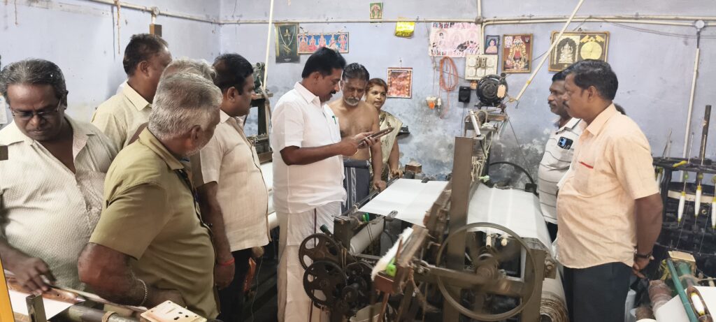 அதனை தொடர்து பகல் 12 மணியளவில் சங்கரபாண்டியபுரம் தெருவில் அமைந்துள்ள முத்துக்கிருஷ்ணன் என்பவரின் தறியில் ஆய்வு செய்து நெசவாளர், கைத்தறித்துறை சார்ந்த கோரிக்கைகளை கேட்டறிந்தார்.