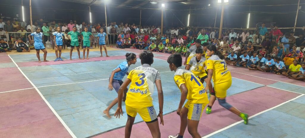 இதேபோல் 9, புள்ளிகள் பெற்ற நாகப்பட்டினம் அணியினரை வீழ்த்தி, அந்தியூர் சக்தி பிரதர்ஸ் கபாடி அணியினர் 40 புள்ளிகள் பெற்று வெற்றி பெற்றனர். தொடர்ந்து போட்டிகள் நடைபெறுகிறது. நள்ளிரவு இறுதி போட்டி நடைபெறும்.