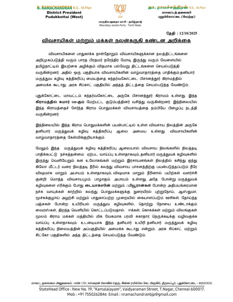 பாரத பிரதமர் நரேந்திர மோடி விவசாயிகளை காக்க நாள்தோறும் விவசாயிகள் நலன்களில் அக்கறை கொண்டு புதிய திட்டங்களை அறிமுகப்படுத்தி வருகின்ற வேலையில் தமிழ்நாடு அரசு விவசாயிகளை அழிக்கின்ற வகையில் செயல்படுவது வேதனையாக உள்ளது. அதேபோல் இயற்கை வளங்கள் நலத்துறை அமைச்சர் சொந்த மாவட்டமான புதுக்கோட்டை மாவட்டத்தில் இயற்கையை அழிக்கும் விதமாகவும் விவசாயிகளின் வாழ்வாதாரத்தை கேள்வி குறியாக்கும் எண்ணத்துடன் விவசாய நிலத்தில் தனியார் மருத்துவ கழிவு சுத்திகரிப்பு நிலையத்தை திறந்து வைக்க முயற்சிப்பது கண்டனத்திற்குரியது. மேலும் இந்த திட்டத்தை அந்தப் பகுதியில் செயல்படுத்த முயற்சித்தால் விவசாயிகளோடு கைகோர்த்து மாபெரும் போராட்டம் நடத்தப்படும்.