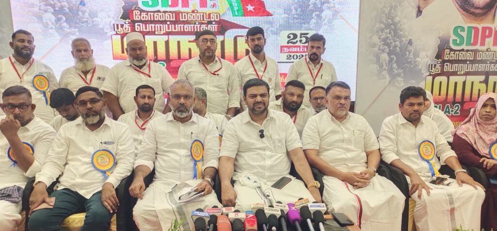 எஸ்.டி.பி.ஐ கட்சியின் பூத் கமிட்டி மாநாடு,கோவை குனியமுத்தூர் பகுதியில் உள்ள தனியார் மண்டப அரங்கில் நடைபெற்றது.மாநாட்டை தொடர்ந்து,எஸ்.டி.பி.ஐ. கட்சியின் மாநிலச் தலைவர் நெல்லை முபாரக் செய்தியாளர்களுக்கு பேட்டி அளித்தார்.