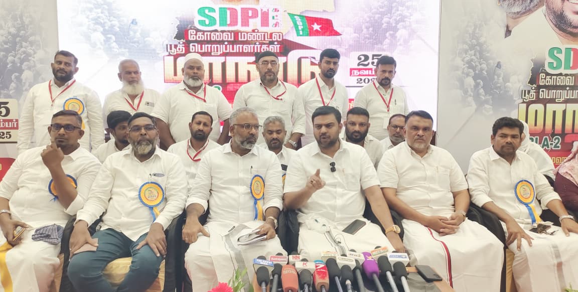 எஸ்.டி.பி.ஐ கட்சியின் பூத் கமிட்டி மாநாடு,கோவை குனியமுத்தூர் பகுதியில் உள்ள தனியார் மண்டப அரங்கில் நடைபெற்றது.மாநாட்டை தொடர்ந்து,எஸ்.டி.பி.ஐ. கட்சியின் மாநிலச் தலைவர் நெல்லை முபாரக் செய்தியாளர்களுக்கு பேட்டி அளித்தார்.
