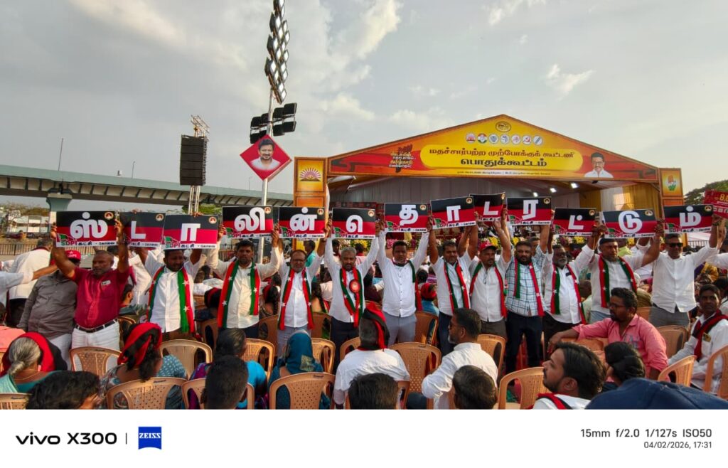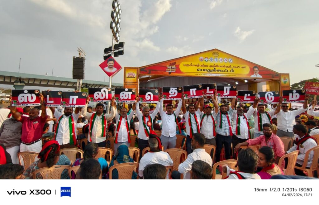 தமிழக சட்டமன்றத் தேர்தல் 2026-க்கான இந்த கூட்டத்தில் திமுக மற்றும் அதன் கூட்டணிக் கட்சிகளைச் சேர்ந்த பல்லாயிரக்கணக்கான தொண்டர்கள் மைதானத்தில் திரண்டு வருகின்றனர். இந்த நிலையில், திமுக கூட்டணியில் அங்கம் வகிக்கும் எஸ்டிபிஐ (SDPI) கட்சியைச் சேர்ந்த தொண்டர்கள் வித்தியாசமான முறையில் தங்களது ஆதரவை வெளிப்படுத்தினர்.