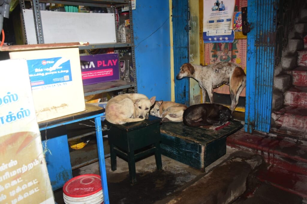 இதன் உச்சகட்டமாக ஐந்துக்கும் மேற்பட்ட தெரு நாய்கள் மொத்தமாக சேர்ந்து வணிக நிறுவனத்திற்குள் நுழைவதும் அங்குள்ள பொருள்களை சேதப்படுத்துவதுமாக வணிகர்களிடத்தில் ஒருவித அச்சத்தை ஏற்படுத்தி வருகிறது
