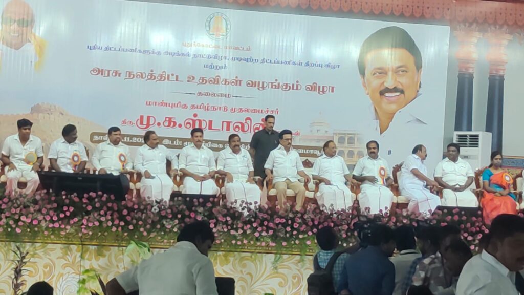 புதுக்கோட்டை மாவட்டம் கீரனூர் அருகே நடைபெற்ற அரசு நலத்திட்ட உதவிகள் வழங்கும் விழாவில் பேசிய தமிழக முதலமைச்சர் மு க ஸ்டாலின் குறிப்பிடுகையில் கலைஞர் அவர்களால் உருவாக்கப்பட்ட மாவட்டம் புதுக்கோட்டை மாவட்டம். புதுக்கோட்டை அமைச்சர்கள் ரகுபதி, மெய்யநாதன் ஆகியோர் சிறப்பாக பணியாற்றி வருகிறார்கள். புதுக்கோட்டை மாவட்ட பொறுப்பு அமைச்சர் ரகுபதி