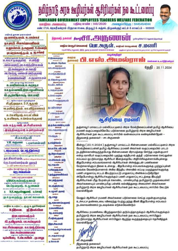 இன்று ( 20.11.2024 ) தஞ்சாவூர் மாவட்டம் சின்னமனை மல்லிப்பட்டினம் அரசு மேல்நிலைப்பள்ளி தமிழ் ஆசிரியை ரமணி அவர்கள் வகுப்பறையில் பாடம் நடத்திக் கொண்டிருந்த போது சின்னமனை கிராமத்தை சேர்ந்த மதன்குமார் என்ற வாலிபர் வகுப்பறையில் புகுந்து கத்தியால் குத்தி படுகொலை செய்துள்ள சம்பவம் ஒட்டுமொத்த ஆசிரியர் இனத்தையே அதிர்ச்சிக்குள்ளாக்கியுள்ளது. இதுபோன்ற சம்பவங்களால் ஆசிரியர்கள் அச்சத்துடன் பணிகளை மேற்கொள்ளும் நிலை உள்ளது. இதபோன்ற சம்பவங்களுக்கு முற்றுப்புள்ளி வைக்க வேண்டுமானால் அகில இந்திய அளவில் எப்படி மருத்துவர்களுக்கு பணி பாதுகாப்பு சட்டம் இயற்றப்பட்டு பாதுகாப்பு அளிக்கப்படுகிறதோ அதேபோன்று ஆசிரியர்களுக்கும் பணி பாதுகாப்பு சட்டத்தை இயற்றி ஆசிரியர்கள் மீது பேரன்புக் கொண்ட மாண்புமிகு தமிழ்நாடு முதலமைச்சர் அவர்களையும் மாண்புமிகு பள்ளிக் கல்வித்துறை அமைச்சர் அவர்களை தமிழ்நாடு அரசு ஊழியர்கள் ஆசிரியர்கள் நல கூட்டமைப்பு சார்பில் கேட்டுக் கொள்கிறேன்