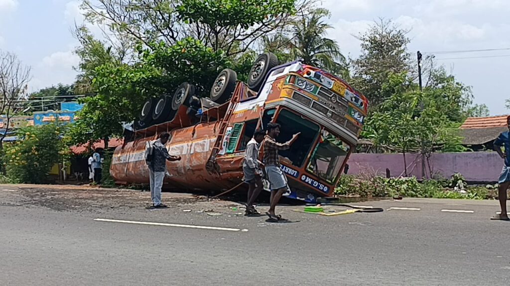 சிவகங்கை மாவட்டம் படமாத்தூர் அருகே உள்ள தனியார் சக்கரை ஆலையில் இருந்து 30 ஆயிரம் லிட்டர் மொளசஸ் என்ற திரவத்தை ஏற்றிக்கொண்டு மதுபான ஆலைக்கு சென்றது. டேங்கர் லாரி, சோழபுரம் அருகே சென்றபோது திடீரென ஓட்டுனரின் கட்டுப்பாட்டை இழந்து சாலையில் தலைகீழாக கவிழ்ந்து விபத்துக்குள்ளானது.