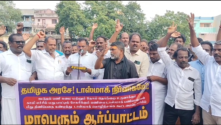 புதுக்கோட்டை மாநகராட்சியில் பகுதியில் இன்று திலகர் திடல் நடைபெற்ற தமிழ்நாடு அரசு டாஸ்மாக் பணியாளர்கள் மாபெரும் கண்டன ஆர்ப்பாட்டம் நடைபெற்றது இப் போராட்டத்தில் 200க்கும் மேற்பட்ட டாஸ்மார்க் ஊழிய ர்கள் கலந்து கொண்டு தமிழ்நாடு அரசை கண்டித்து டாஸ்மார்க் நிர்வாக ஊழியர்கள் கூடுதல் பணிச்சுமை மற்றும் தொற்று நோய்களை உருவாக்கும் காளி எச்சில் மது பாட்டில்கள் சேகரிக்கும் பணியை பணியாளர்கள் மீது திணிக்காத என்ற கண்டன கோசங்களை எழுப்பினர்.
