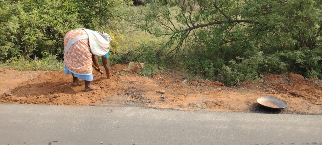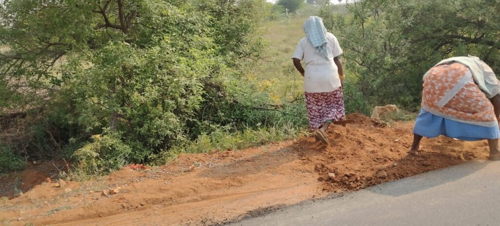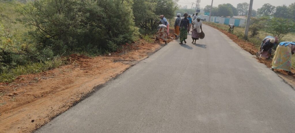 மேலும் சாலை அமைக்கப்பட்ட இரு ஓரங்களிலும் மண் நிரப்ப வேண்டும். ஆனால் இதற்கு மாறாக மண் நிரப்பப்படாமல் மண்வெட்டியால் பெயருக்கு கொத்தி விட்டு சென்றனர்.