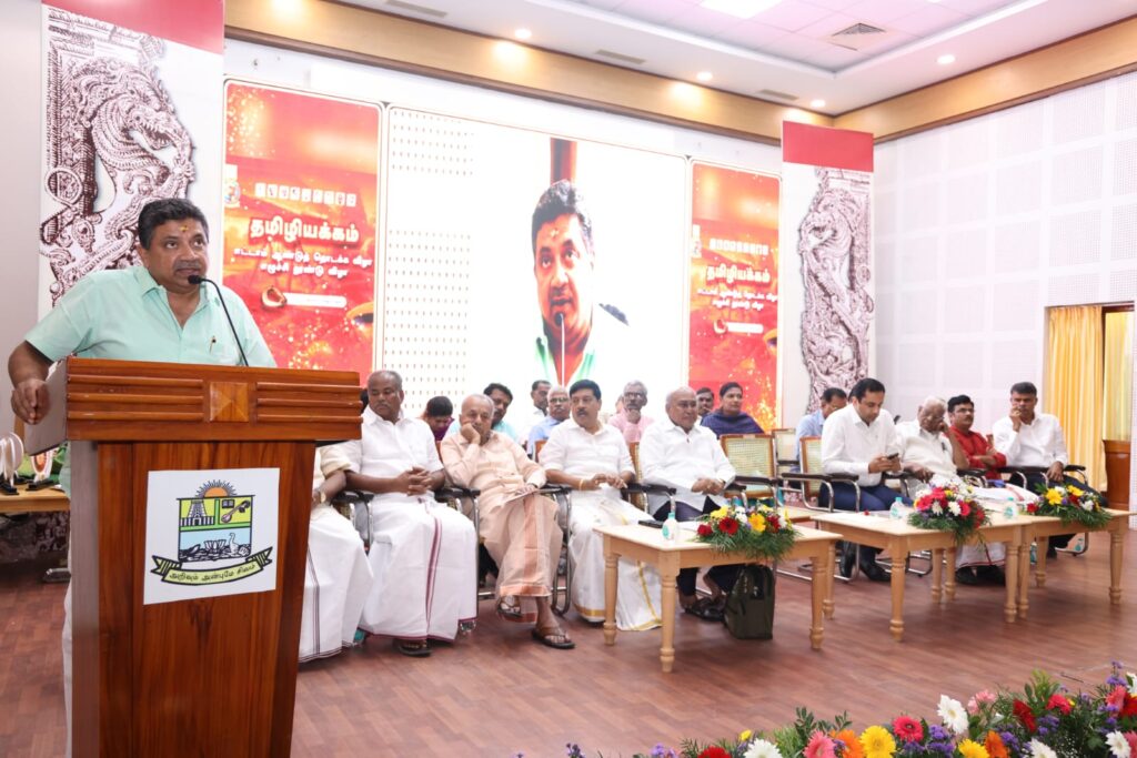 விழாவில், தகவல் தொழில் நுட்பத்துறை அமைச்சர் பழனிவேல் தியாகராஜன் பேசியதாவது: தமிழக அரசு தமிழுக்கு பல்வேறு வகையில் தொண்டாற்றி வருகிறது. ஒரே நாடு, ஒரே மொழி, ஒரே மதம் என்ற பன்முகத்தன்மை வாய்ந்த குணத்தை மாற்றும் முயற்சிகளை நாட்டிலேயே எதிர்த்து தமிழகத்தின் உரிமைகளை பாதுகாக்க முதல்வர் ஸ்டாலின் நடவடிக்கை எடுத்து வருகிறார்.