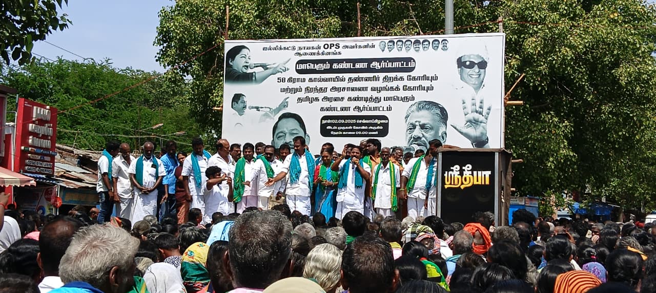 58 கால்வாயில் தண்ணீர் திறக்க கோரியும், கால தமதப்படுத்தி வரும் திமுக அரசை கண்டித்தும் கண்டன கோசங்களை எழுப்பி ஆர்ப்பாட்டம் நடைபெற்றது.