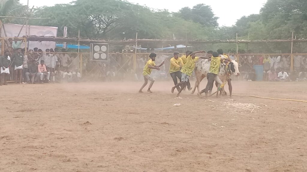 வீரர்கள் குழுக்களாக தேர்ந்தெடுக்கப்பட்டு ஆக்ரோஷமாக விளையாடிய காளைகளை அடக்கினர்.