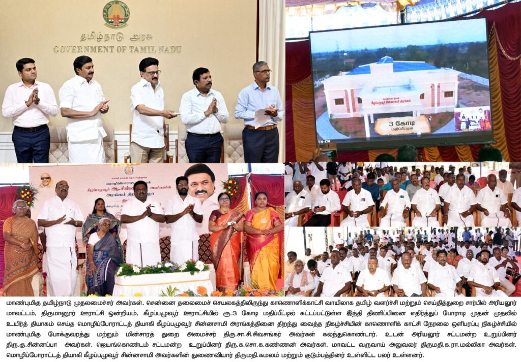 தமிழ்நாடு முதலமைச்சர் மு க ஸ்டாலின், சென்னை தலைமைச் செயலகத்திலிருந்து காணொளிக்காட்சி வாயிலாக தமிழ் வளர்ச்சி மற்றும் செய்தித்துறை சார்பில் அரியலூர் மாவட்டம், திருமானூர் ஊராட்சி ஒன்றியம், கீழப்பழுவூர் ஊராட்சியில் ரூ.3 கோடி மதிப்பீட்டில் கட்டப்பட்டுள்ள மொழிப்போராட்டத் தியாகி கீழப்பழுவூர் சின்னசாமி அரங்கத்தினை திறந்து வைத்தார்.