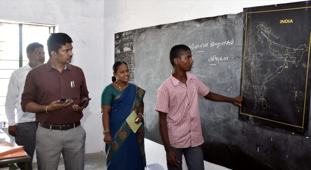 ,விஜயகரிசல்குளம் அரசு மேல்நிலைப் பள்ளியில் மாணவர்களின் கற்றல், கற்பித்தல், வாசிப்பு திறன் உள்ளிட்டவை குறித்து கேட்டறிந்து மாணவர்களுடன் உரையாற்றினார்.