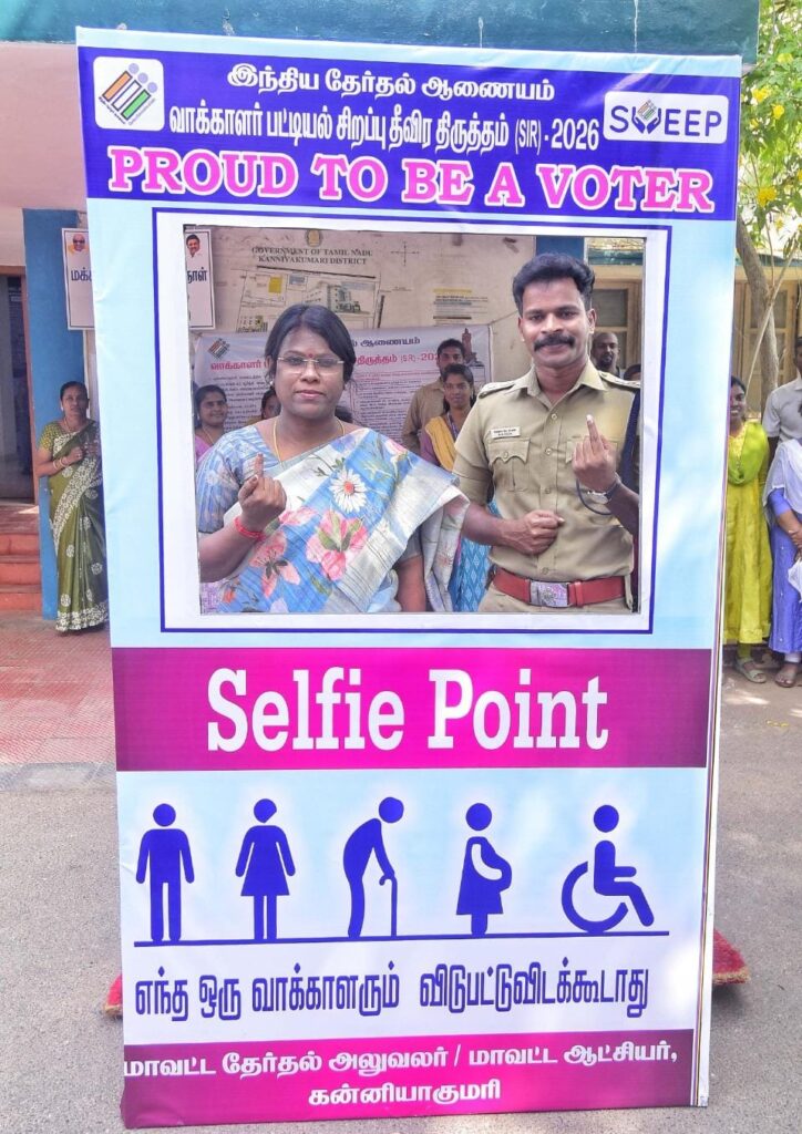 கன்னியாகுமரி மாவட்ட ஆட்சியர் அலுவலக வளாகத்தில் மாவட்டத்திற்குட்பட்ட வாக்காளர்கள் அனைவரும் இறுதி வாக்காளர் பட்டியலில் இடம்பெறுவது குறித்து இன்று (30.12.2025) மாவட்ட ஆட்சித்தலைவர் திருமதி.ஆர்.அழகுமீனா, இ.ஆ.ப., அவர்கள், மாவட்ட காவல் கண்காணிப்பாளர் மரு.ஸ்டாலின், இ.கா.ப., அவர்கள் முன்னிலையில் Selfie Point -apy; புகைப்படம் எடுத்து விழிப்புணர்வு ஏற்படுத்தினார்கள்.