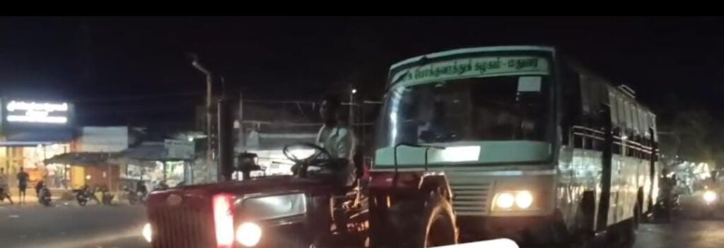 டிராக்டர் அரசு பேருந்தை கட்டி இழுத்து வந்த காட்சியை ஆச்சரியத்துடன் பொதுமக்கள் பார்த்தனர். 2 நாட்களுக்கு முன்பு கரகாட்டக்காரன் பட பாணியில் அரசு பேருந்தின் டயர் கழண்டு பேருந்தை முந்தி சென்றது. இது குறித்து நடவடிக்கை எடுப்பது யார் என்று கேள்வி எழுப்பி சென்றனர். இந்த வீடியோ தற்போது சமூக வலைதளங்களில் வைரலாகி வருகிறது.