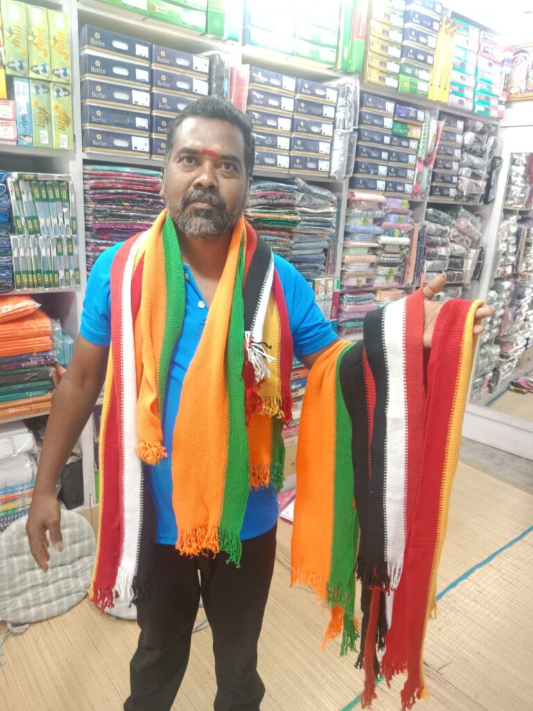 ஜவுளி கடைகளில் திமுக, அதிமுக, பாஜக, காங்கிரஸ், தவெக, கம்யூனிஸ்ட் உள்ளிட்ட அனைத்துக் கட்சி கலர் துண்டுகள் விற்பனைக்கு வைக்கப்பட்டு உள்ளன.