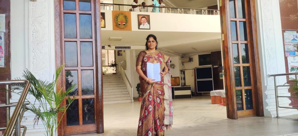 தேனி மாவட்டம் வீரபாண்டி பேரூராட்சி தலைவராக இருந்து வருபவர் கீதா சசி. அவர் தேனி மாவட்ட கலெக்டர் அலுவலகத்தில் மாவட்ட வருவாய் அலுவலர் மகாலட்சுமிடம் கோர்க்கை மனு கொடுத்துள்ளார்.