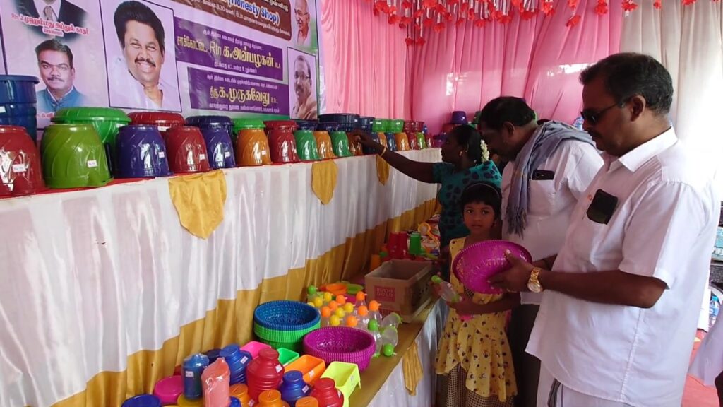 பிஸ்கட், பேஸ்ட், கடலை மிட்டாய், பென்சில், பேனா, ஸ்கேல், டஸ்ட் பின், கப், மகாத்மா காந்தியின் சத்திய சோதனை புத்தகம் மற்றும் வீட்டு உபயோகப் பொருட்கள் ஸ்டிக்கர் ஒட்டப்பட்ட விலையுடன் விற்பனைக்கு வைக்கப் பட்டிருந்தது. மக்கள் தங்களுக்குத் தேவையானப் பொருட்களை எடுத்துக்கொண்டு அதற்கான பணத்தை கல்லாபெட்டியில் போட்டனர். ரூ.10ஆயிரம் மதிப்புள்ள பொருட்கள் கடையில் வைக்கப்பட்டு இருந்தது.