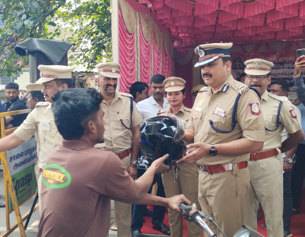 மேலும் அவர்களுக்கு தலைக்கவசம் குறித்து நேரடியாக விழிப்புணர்வு செய்தார்.ஒரு சிலர் பின்னால் அமர்ந்து ஹெல்மெட் அணியாமல் வந்தவர்களுக்கும் ஹெல்மெட் வழங்கி அறிவுரை வழங்கினார். இந்த நிகழ்ச்சியில் போக்குவரத்து துணை ஆணையர்,உதவி ஆணையர்கள் மற்றும் போக்குவரத்து போலீசார் உள்ளிட்ட பலரும் கலந்து கொண்டனர்.