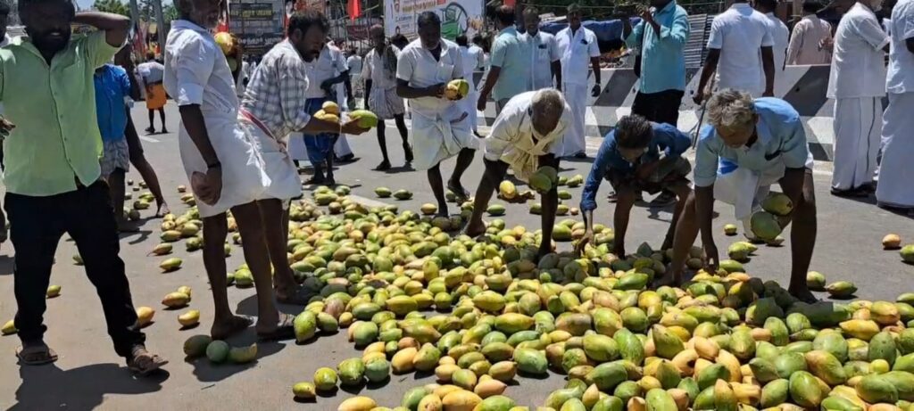 அதிலும் ஒருவர் தான் கட்டியிருந்த லுங்கியை அவிழ்த்து அதில் மாங்காய்களை சேகரித்து கொண்டு சென்றார். மேலும் பேருந்து நிலையம் முன்பு நடைபெற்ற ஆர்ப்பாட்டம் என்பதால் பயணிகள் அதிகளவு செல்லும் சாலையில் இந்த மாங்காய்கள் கொட்டி கிடந்ததால் ஏராளமானோர் மாங்காய்களை தேர்ந்தெடுத்து அள்ளிச்சென்றனர்.