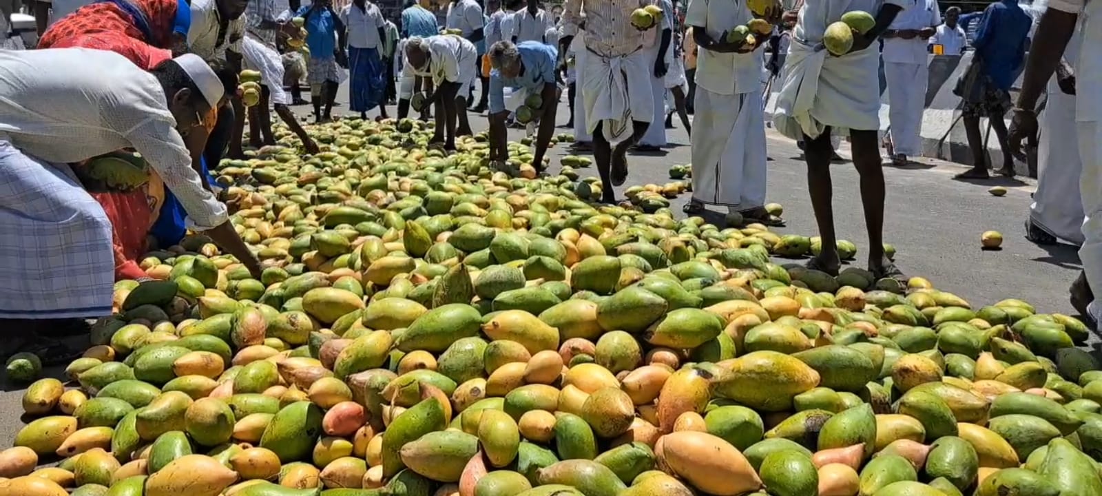 அதிலும் ஒருவர் தான் கட்டியிருந்த லுங்கியை அவிழ்த்து அதில் மாங்காய்களை சேகரித்து கொண்டு சென்றார். மேலும் பேருந்து நிலையம் முன்பு நடைபெற்ற ஆர்ப்பாட்டம் என்பதால் பயணிகள் அதிகளவு செல்லும் சாலையில் இந்த மாங்காய்கள் கொட்டி கிடந்ததால் ஏராளமானோர் மாங்காய்களை தேர்ந்தெடுத்து அள்ளிச்சென்றனர்.