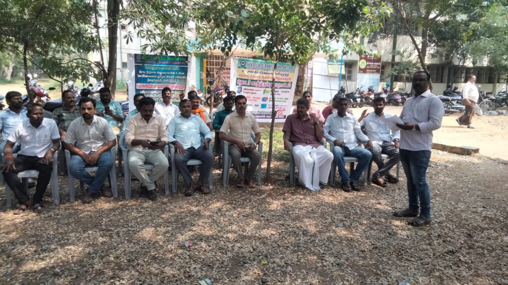 இந்த போராட்டத்திற்கு வட்ட கிளை தலைவர் ஜெயபிரகாஷ் தலைமை தாங்கி போராட்டத்தை தொடங்கி வைத்து பேசினார். வட்டச் செயலாளர் ஜெகதீசன் முன்னிலை வகித்தார். வட்ட பொருளாளர் சுரேஷ் கண்ணன் வரவேற்றார். மாவட்ட அமைப்பு செயலாளர் நயினார் முகமது போராட்டத்தை விளக்கி பேசினார். இதில் ஏராளமான கிராம நிர்வாக அலுவலர்கள் கலந்து கொண்டனர்.