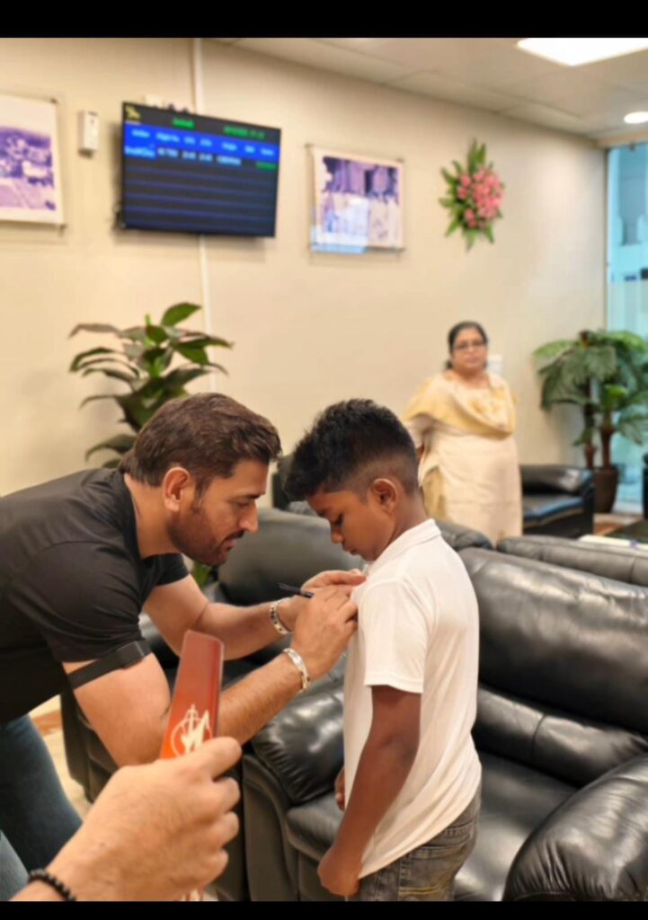 இந்த நிலையில் மதுரையை சேர்ந்த ஆறாம் வகுப்பு மாணவன் வெற்றிமாறன் தோனியை நேரில் சந்தித்து டி-ஷர்டில் அவரது ஆட்டோகிராபை பெற்றுக் கொண்டார். இது குறித்து சிறுவன் வெற்றிமாறன் கூறுகையில்: