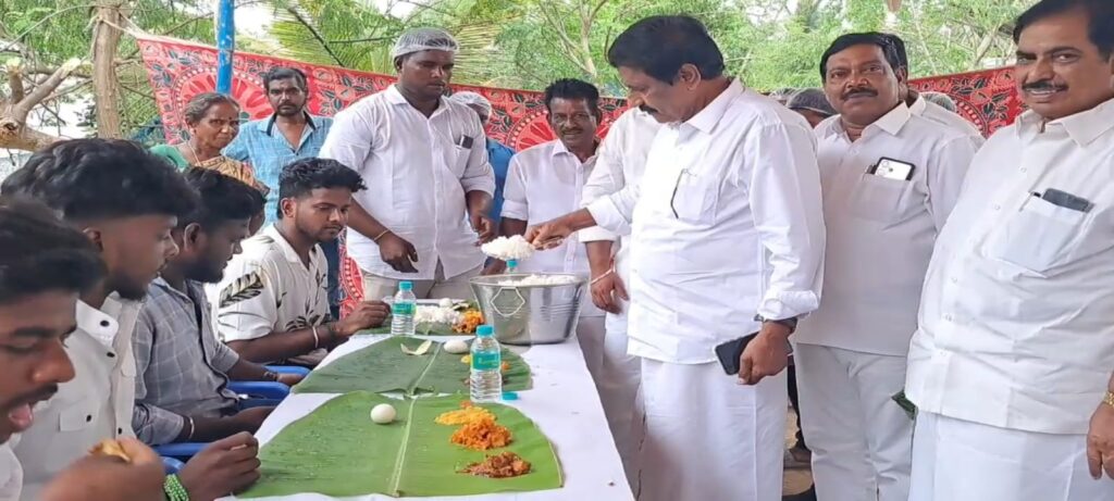 தொடர்ந்து தனது வீட்டின் அருகே சாமியானா போட்டு அமைக்கப்பட்டு இருந்த விருபந்தலில் விருந்து உபசரிக்க நிகழ்வு நடைபெற்றது.