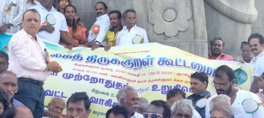 முன்னதாக,கன்னியாகுமரி கடல் நடுவில் அமைந்துள்ள ஐயன் திருவள்ளுவர் சிலை காலடியில் பேராசிரியர் முது முனைவர் பா. வளன்அரசு தலைமையில்,உலகத் திருக்குறள் கூட்டமைப்பு மாநில,மாவட்ட நிருவாகிகள் திருக்குறள் முற்றோதல், உறுதிமொழி எடுத்துக்கொண்டனர்.