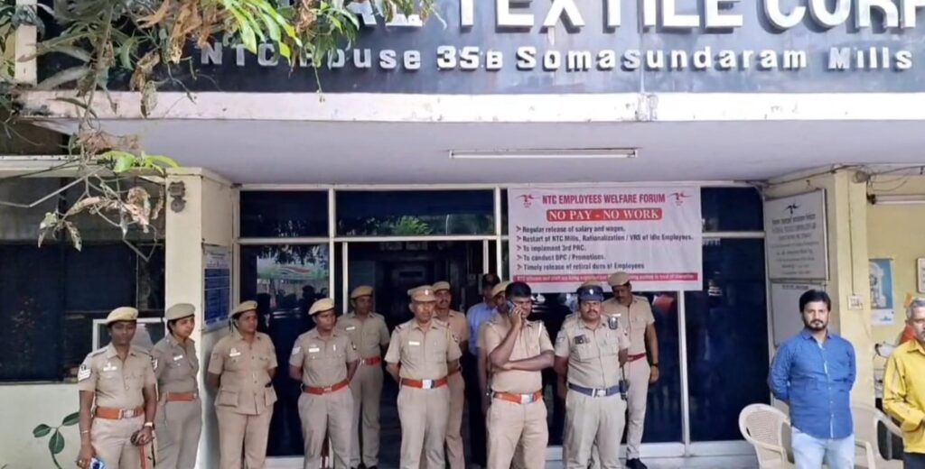 கோவை காட்டூர் பகுதியில் உள்ள தேசிய பஞ்சாலை கழக அலுவலகத்தை 5 மாதமாக சம்பளமாக கொடுக்கவில்லை எனவும், அரியர் தொகையும் வழங்கவில்லை எனக் கூறியும், மத்திய அரசுக்கு சொந்தமான தேசிய பஞ்சாலை கழகத்திற்கு சொந்தமான ஆலைகள் 2020 முதல் இயக்கப்பட வில்லை எனவும் தொழிலாளர்களுக்கு பாதி சம்பளம் மட்டும் வழங்கி வந்த நிலையில் தற்போது அந்த ஊதியமும் வழங்கவில்லை எனக் கூறி தொழிலாளர்கள குடும்பத்துடன் கையில் பூட்டுடன் தேசிய பஞ்சாலை கழக அலுவலக வளாகத்தில் முற்றுகை போராட்டத்தில் ஈடுபட்டதால் பரபரப்பு ஏற்பட்டது.