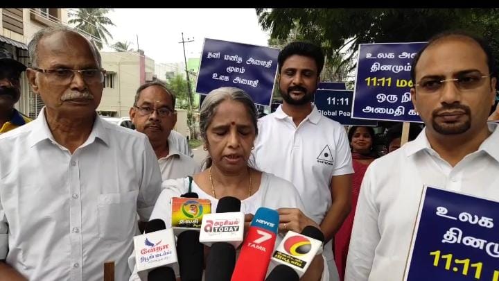 உலக சமாதான அறக்கட்டளை சார்பில் பேசுகையில், “உலகப் போர் முடிந்தபின் உலக அமைதிக்காக ஒரு நிமிடம் பிரார்த்தனை செய்யும் பழக்கம் இருந்தது. அதனை மீண்டும் மக்களிடையே கொண்டு வரவே, ஒவ்வொரு நாளும் காலை 11 மணி 11 நிமிடத்திற்கு, உலகம் முழுவதும் மக்கள் ஒரு நிமிடம் அமைதிக்காக சிந்தனை செய்ய வேண்டும்,” என தெரிவித்தனர்.