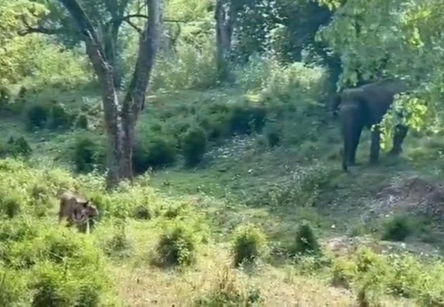 சிறிது தூரம் வேகமாக யானையிடம் இருந்து தப்பித்து ஓடிய புலி மெதுமாக வனப்பகுதிக்குள் நடந்து சென்றது. இந்த மெய்சிலிர்க்கும் காட்சிகளை நேரடியாக கண்டு ரசித்த சுற்றுலா பயணிகள் பிரமிப்படைந்தனர்.