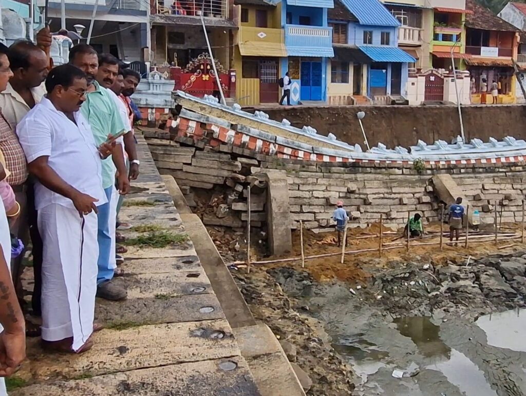 சுசீந்திரம் தாணுமாலய சுவாமி திருக்கோயில் தெப்பக்குளத்தினை சீரமைக்கும் பணி நடைபெற்று வரும் வேளையில் தொடர் மழை காரணமாக மண் ஈர்ப்பு நிலையில் தொப்பக்குளத்தின் வடக்கு பக்ககரையில் ஒரு பகுதி திடீரெ இடிந்து விழுந்து விட்டது.