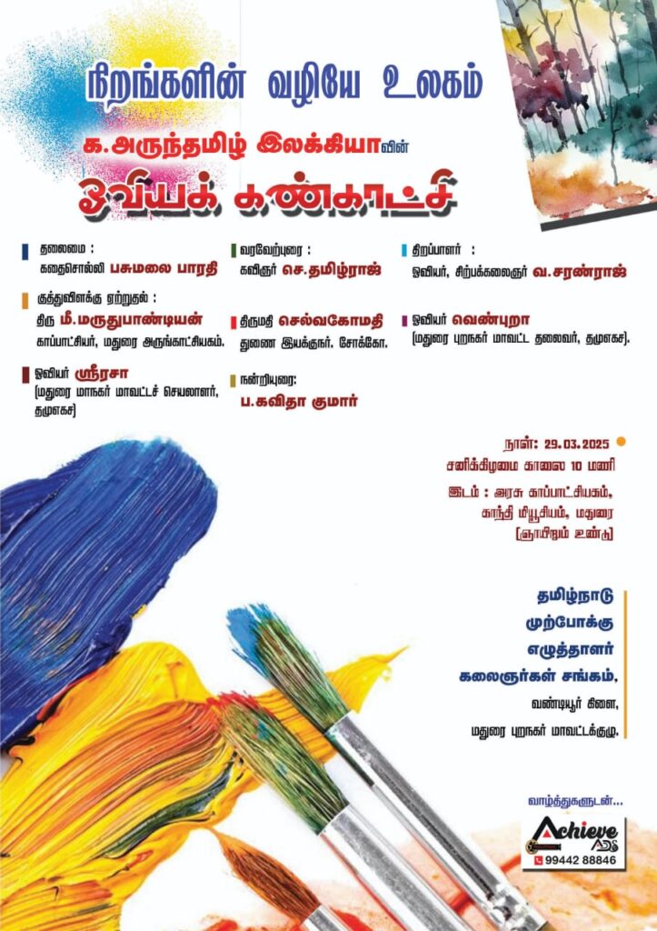 தமிழ்நாடு முற்போக்கு எழுத்தாளர் கலைஞர்கள் சங்கம், வண்டியூர் கிளை, மதுரை புறநகர் மாவட்டக்குழு சார்பில், மதுரை அரசு அருங்காட்சியகம், காந்தி மியூசியத்தில் வரும் சனி மற்றும் ஞாயிறு (29.03.25 மற்றும் 30.03.25) ஆகிய நாட்களில், நிறங்களின் வழியே உலகம் என்ற தலைப்பில், ஓவியர் க.அருந்தமிழ் இலக்கியாவின்
