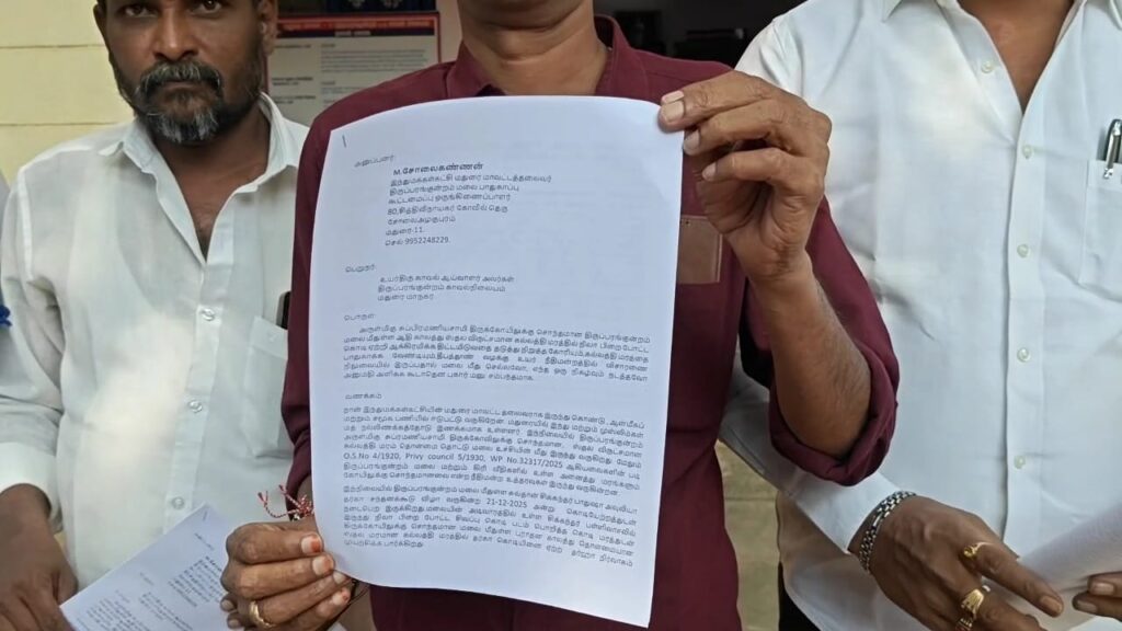 இந்து மக்கள் கட்சி மதுரை மாவட்ட தலைவர் சோலை கண்ணன் திருப்பரங்குன்றம் மலை பாதுகாப்பு கூட்டமைப்பு நிர்வாகிகள் திருப்பரங்குன்றம் காவல் நிலையத்தில் சந்தனக்கூடு மற்றும் கல்லத்தி மரம் தொடர்பாக புகார் மனு அளித்துள்ளனர்.